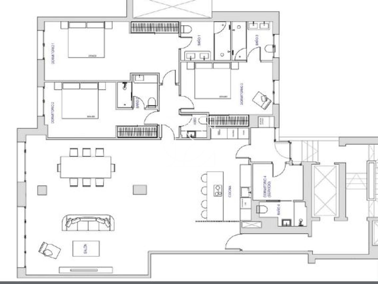 En la zona de descanso, el piso cuenta con tres dormitorios de excelente tamaño, cada uno con baño en suite. La vivienda dispone de calefacción central y aire acondicionado. El edificio cuenta con servicio de portería.